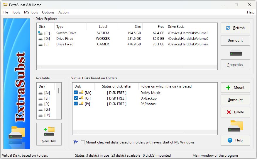 ExtraSubst создает виртуальные диски на основе выбранных папок, гарантируя, что физические диски останутся нетронутыми и неразделенными.